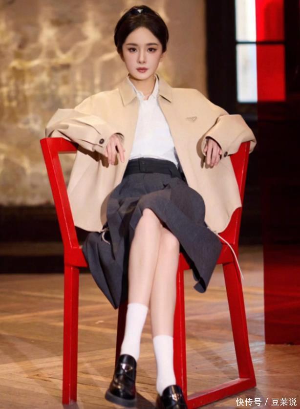她在活动现场的衣着搭配十分的清爽,上半身是一件白色的衬衫,外面还披着一件奶棕色的外套,外套在灯光的映照下显现出细腻的光泽,看起来质感非常不错。 她在下半身也花了不少的心思,一件灰色的百褶裙搭配着脚上的小皮鞋,看起来十分的清纯。